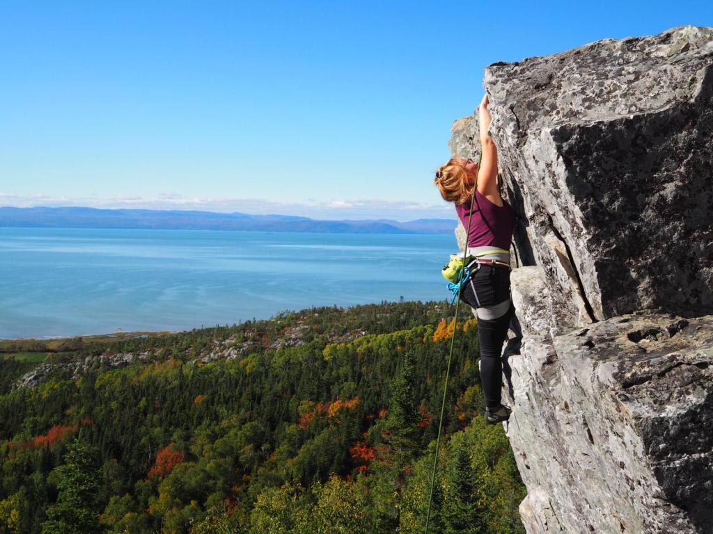 Quand je suis arrivée au Québec pour mes études, naturellement, l’un de mes premiers réflexes a été de m’inscrire à la salle d’escalade de l’université. Ça a été un tremplin dans mon intégration québécoise, j’y ai rencontré de précieuses amitiés, et j’ai renoué avec le rocher! On se retrouvait après les cours et on attendait que les lumières s’éteignent, à 23h, pour rentrer chez nous. Avec mon amie Noémie, on a fait des centaines de kilomètres en pouce pour aller grimper au mont Kékéko en Abitibi. Avec Amélie et Jo’, on a même été en France, relier en Twingo les sites d’escalade de la Bretagne à la Provence en passant par les Pyrénées. L’histoire dit même qu’on a eu un lift en hélicoptère… Avec Alex, Aline, puis avec Orianne, Yohan, Vincent et Quentin, on se levait avant le soleil le weekend pour aller découvrir les parois des Laurentides, et on n’attendait pas que la neige ait fondu pour se précipiter dehors au printemps. Avec tous ces humains formidables, on a grimpé sur la plage, on a grimpé dans des grottes, on a assuré d’un canot, on est monté avec l’océan dans le dos, on est redescendu à la frontale, on a eu faim, on a eu soif, on a eu froid, mais tant qu’on avait du vent dans les cheveux, les pieds confinés dans nos souliers trop petits et de la roche au bout des doigts, on était content.