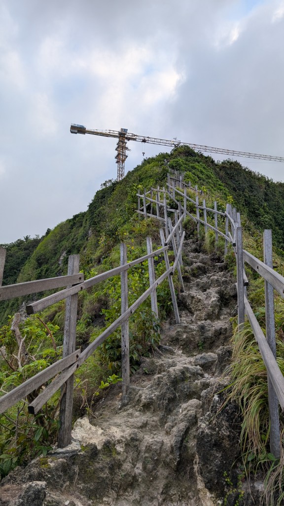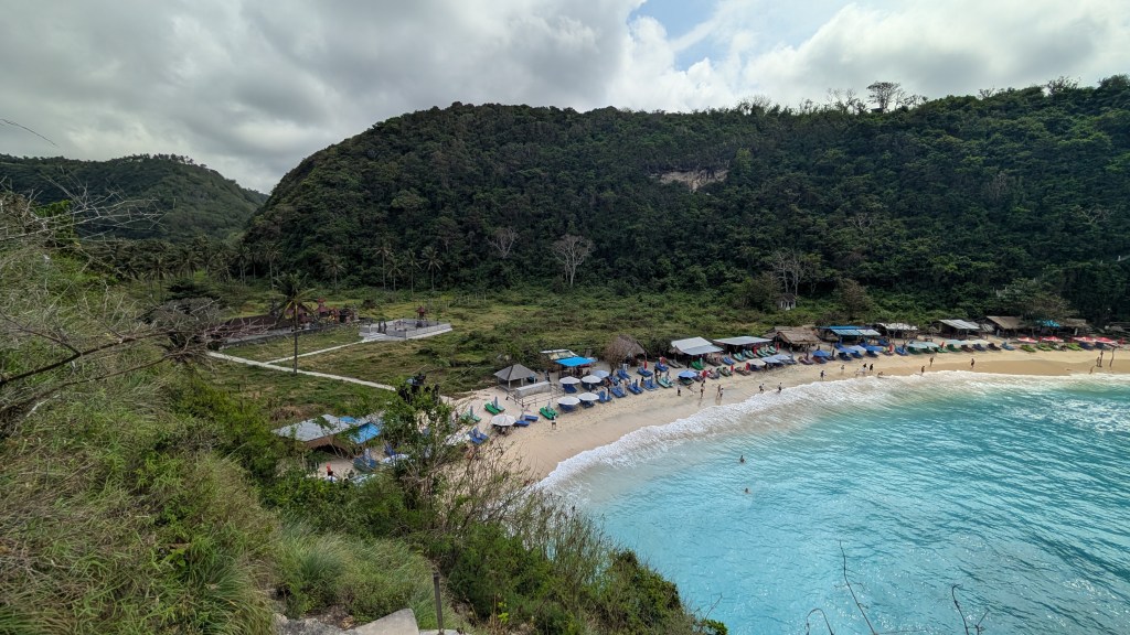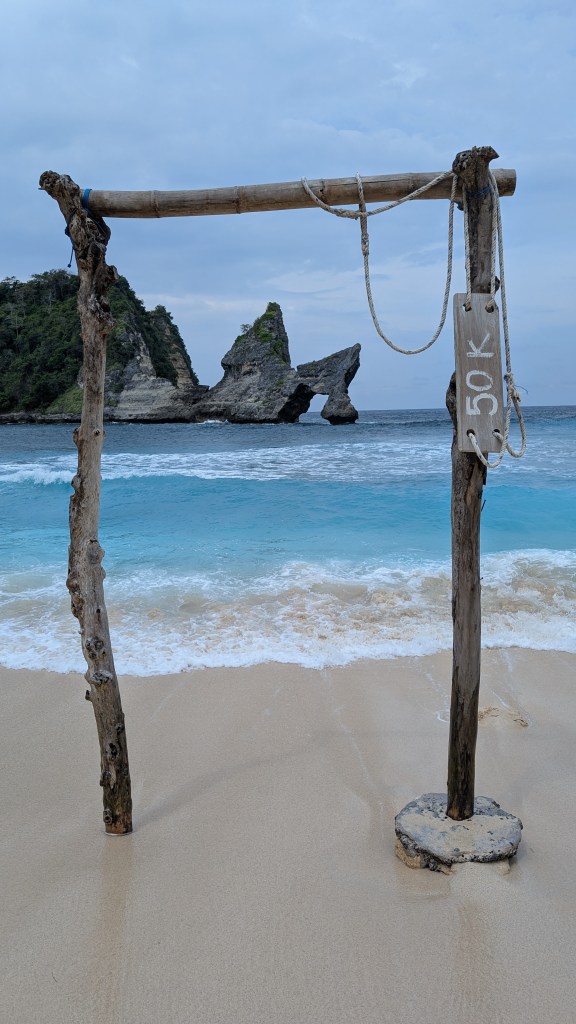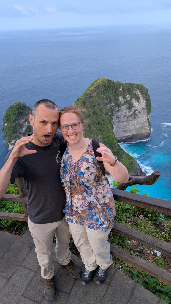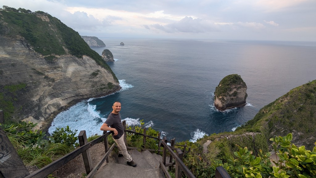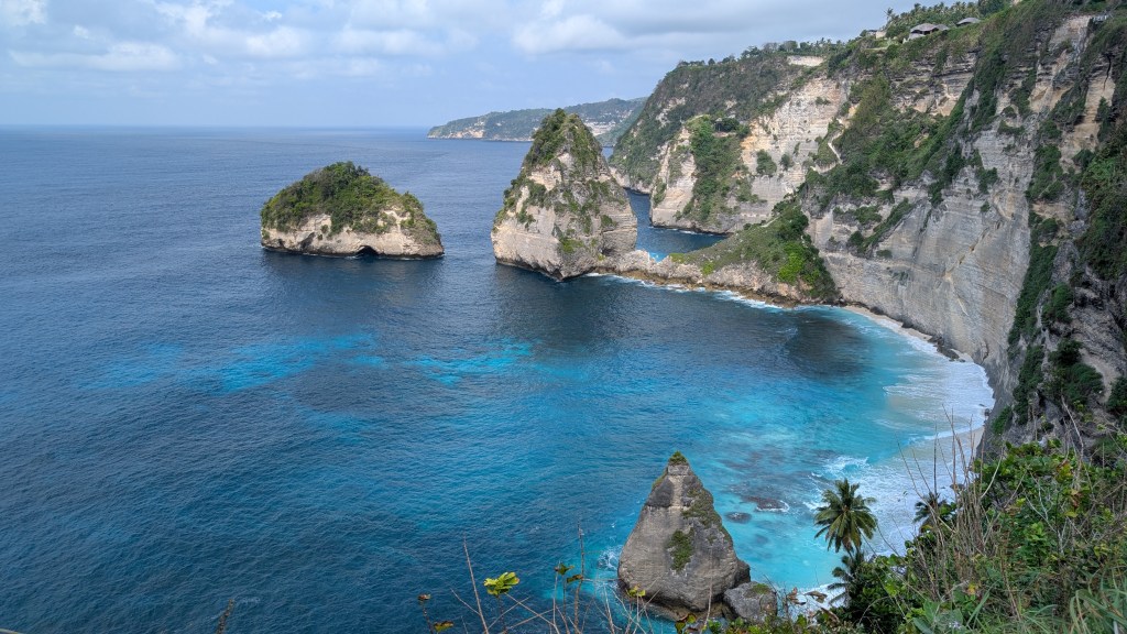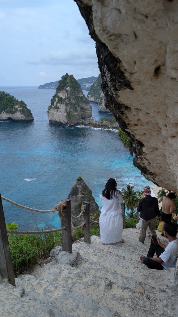 C’est aussi une île dont les paysages sont à couper le souffle. Sur la côte sud, nous avons admiré plusieurs baies, toutes plus grandioses les unes que les autres. Kelingking tôt le matin n’était pas trop achalandée. On a vu des raies mantas géantes du haut de la falaise. Ce que les guides touristiques ne disent pas, c’est qu’ils sont en train de fabriquer un immense ascenseur pour descendre sur la plage… Dommage pour mère nature.