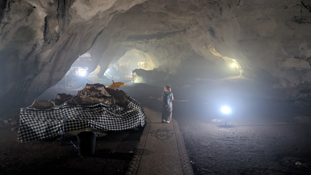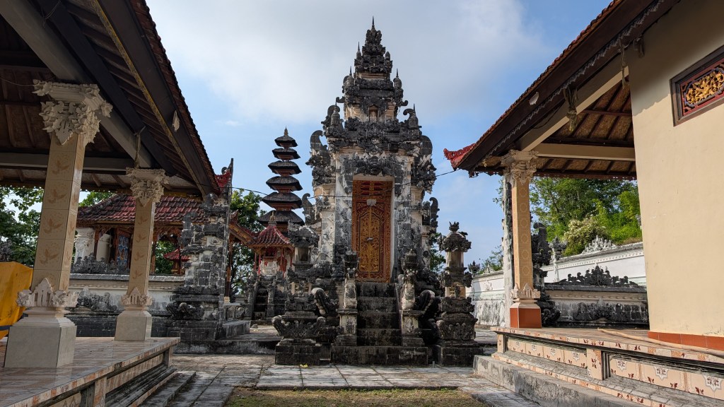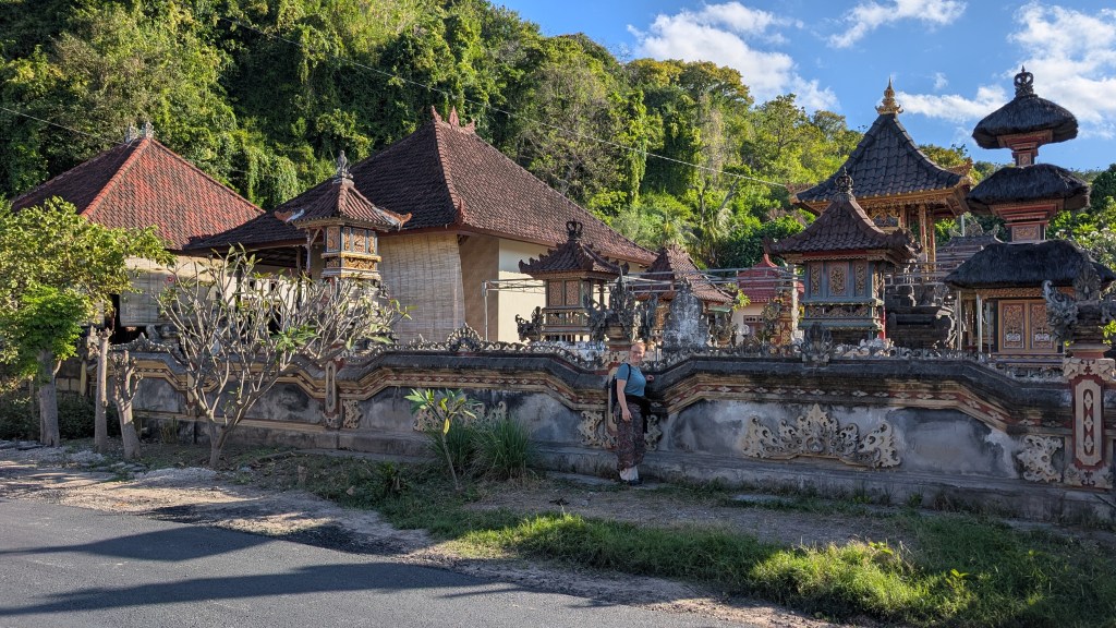 C’est une ile aux mille temples. Il y en a vraiment beaucoup, plus ou moins grands, plus ou moins beaux, plus ou moins entretenus. La grande majorité des habitants de l’île est hindouiste, avec une petite enclave musulmane au port. Nous avons visité le Pura Goa Giri Putri qui fait face à la mer : il fallait porter l’habit traditionnel pour y entrer, monter un grand escalier. À noter que les femmes menstruées n’ont pas le droit d’y entrer. Après une petite cérémonie où on nous a jeté de l’eau bénie à la face, sur la tête et dans les mains et où on a du essayer de se coller du riz sur le front (on vous donne une description objective, car on n’est pas encore familiers avec les significations), on nous a fait entrer dans une immense grotte comme on n’en a jamais vue. Il y a plein d’hommes qui sont allongés dans la grotte et qui ne font rien d’autre que discuter, rire ou faire la sieste, d’autres qui passent le balais en attendant la prochaine prière, bénédiction ou autre. La sortie de la grotte, côté montagne, nous amène dans une forêt luxuriante pleine de macaques (et de chiens).