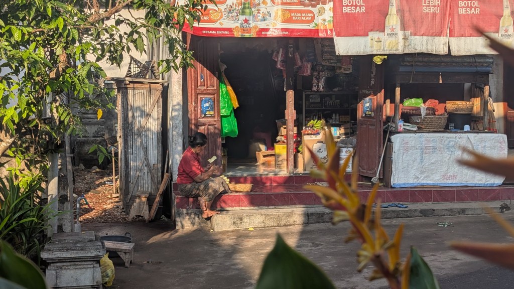 C’est une ile aux mille odeurs. L’encens agrémente les offrandes disposées un peu partout. Beaucoup de gens fument. On a tendance à brûler les déchets en petits tas fumants entre les bananiers. Les scooters et les bateaux sentent le gaz à plein nez. Le « nasi goreng » embaume les rues : c’est du riz frit. On mange local, le plus souvent dans des petits boui-bouis pour 2 à 4 $ par personne. Sans oublier la bonne odeur d’humidité de nos vêtements qui ne veulent pas sécher.