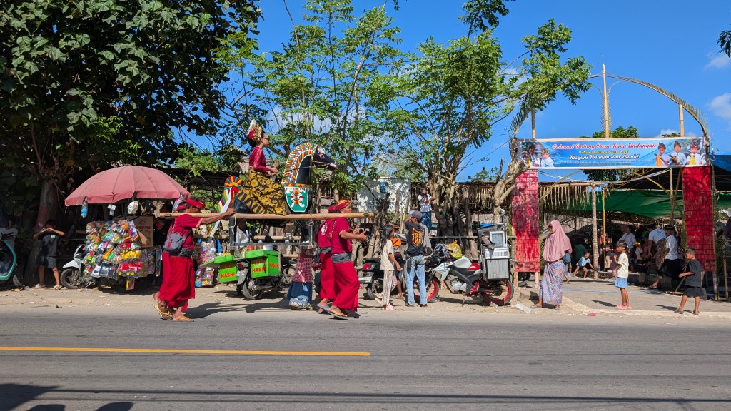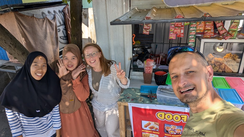 C’est une île où nous avons réussi à nous éloigner des sentiers battus, pour le plus grand bonheur des enfants qui ne manquaient aucune occasion pour nous faire des coucou sur le bord de la route. Quand aux adultes, toujours un cellulaire sous la main, ils ont capté plusieurs photos de nous. Un jour, l’appel de l’estomac nous a fait arrêter au bord de la route, à un bazar organisé par l’armée de l’air de Lombok. Le gars à l’animation nous a remercié d’un thank you sir, dans ses haut parleurs.