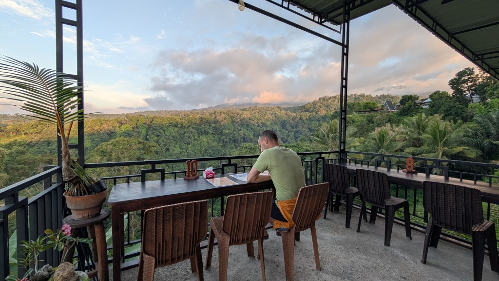 Enfin, un petit chemin hors des sentiers battus annonce le début d’une longue montée où on fait chauffer notre monture. Heureusement l’air se rafraîchit et nous arrivons bientôt à notre hébergement, accueillis par une gang de jeunes locaux jouant de la guitar sur les marches. Le ton est jovial, les « r » sont roulés pour une raison inconnue et nous déposons nos sacs dans notre chambre sur des airs de Bob Marley, Bob Dylan et autres interprétations franchement réussies. On suit la recommandation de notre hôte pour un petit restaurant local pas loin où on se délecte d’un merveilleux curry de crevettes et un cari de poulet à la papaye (avec du riz bien sûr!). On se couche tôt car demain rendez-vous à 7h pour le covoiturage jusqu’au départ de la randonnée.