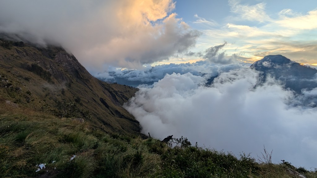 Heureusement la brume se lève d’un coup et dissipe ma tristesse. La vue qui se dégage devant mes yeux est sublime : nous aperçevons doucement l’autre côté de la Caldera, puis le lac tout en bas se dévoile peu à peu. Le sommet du volcan devient de moins en moins timide et affiche, libéré de ses chaines de nuages, tout sa splendeur aux tons de rouge clair et de bordeau fumé. Nous découvrons le chemin qu’il nous faudra encore gravir dans la nuit, l’arrête semble nous inviter à un concours d’équilibre. Se soleil se couchant, les reflets rougeoyants rendent le paysage encore plus épique. Nous mangeons un curry de poulet délicieusement épicé et allons nous coucher vers 19h. Tout autour les gens sont excités et parlent à n’en plus finir. Les deux jeunes Suisses dans la tente d’à côté sont partis dans de grandes discussions en Suisse-Allemand avec une voix forte et grave qui résonne par le sol jusqu’à nos tympans. Un groupe de filles non loin contre balance avec leurs voix aiguës et leur énergie festive. Nous on aimerait bien nous reposer avant le grand push. Nous mettons donc nos boules-quies afin d’atténuer un peu tout ce bruit ambiant. Le marchand de sable ne semble pas vouloir passer mais Morphée elle me plonge dans un sommeil agité par l’excitation de l’épreuve à venir.