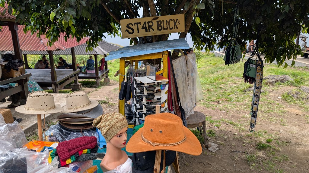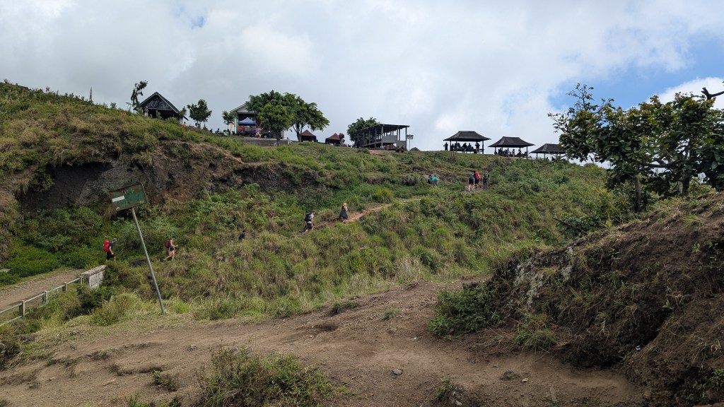Après 400m de montée, nous voilà justement arrivés au 2ème poste. C’est le jour et la nuit par rapport au poste 1 : il y a des magasins ambulants qui vendent des chips, des boissons gazeuses, de la bière, du café, du thé, des chapeaux, des casquettes, des lunettes de soleil et tout un tas d’autres choses à manger, à boire ou à l’utilité plus ou moins appropriée. Il y a aussi des plateformes surélevées carrées avec des toitures et on s’aperçoit que c’est là que les différents groupes se réunissent en attendant que le repas soit servi. Et quel repas préparé par nos porteurs! Un nasi goreng, un riz frit avec des épices et quelques légumes, surmonté d’un œuf au plat. Le tout suivi d’un plateau de fruits frais : ananas, bananes et pommes soigneusement découpés et présentés. La montagne c’est comme la mer : ça creuse! On se délecte de nos plats sur de la musique de Bob Marley jouée dans des enceintes on ne sait où. C’est vraiment une star intemporelle et passe partout ce Bob. À peine notre repas et notre boisson gazeuse terminés, notre guide nous fait signe qu’il est temps de repartir. Apparemment il ne faut pas arriver trop tard au sommet de la Caldera pour ne pas se coucher trop tard. En effet on attaque le sommet dans la nuit, vers 2h du matin me dit-on.
