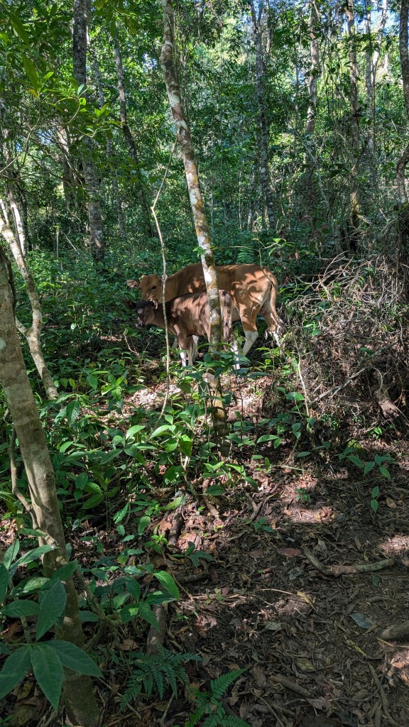 D’un coup, nous passons d’une flore herbacée et rase à une forêt luxuriante remplie de liagnes et de vaches se promenant et broutant en liberté. Peut-être se protègent-elle du soleil qui tappe déjà bien fort à 9h du matin. Nous croisons aussi plusieurs macaques qui viennent assouvir leur curiosité, nous baillant dans la face en passant et retournant rapidement à leur occupation une fois les premiers randonneurs croisés. On entend au loin des motocyclettes, certainement des marcheurs déposés au début du sentier me dis-je. Nous arrivons facilement au premier poste synonyme de première petite pause pour tout le monde. C’est un endroit simple, plat, sans aucune commodité mais à l’ombre. On ajuste notre équipement et le nombre de couches que l’on porte car il fait de plus en plus chaud et humide. On découvre aussi que les bruits de pot d’échappement que l’on entendait étaient en fait des motos tout terrain qui font le taxi jusqu’au poste 2 pour les touristes qui le souhaitent. Eux aussi font une petite pause avant de remonter sur leurs bolides et de filer à toute vitesse sur la pente doucement bosselée qui s’offre à nous. Concept encore une fois particulier et qui ne me serait pas venu à l’esprit pour une randonnée…