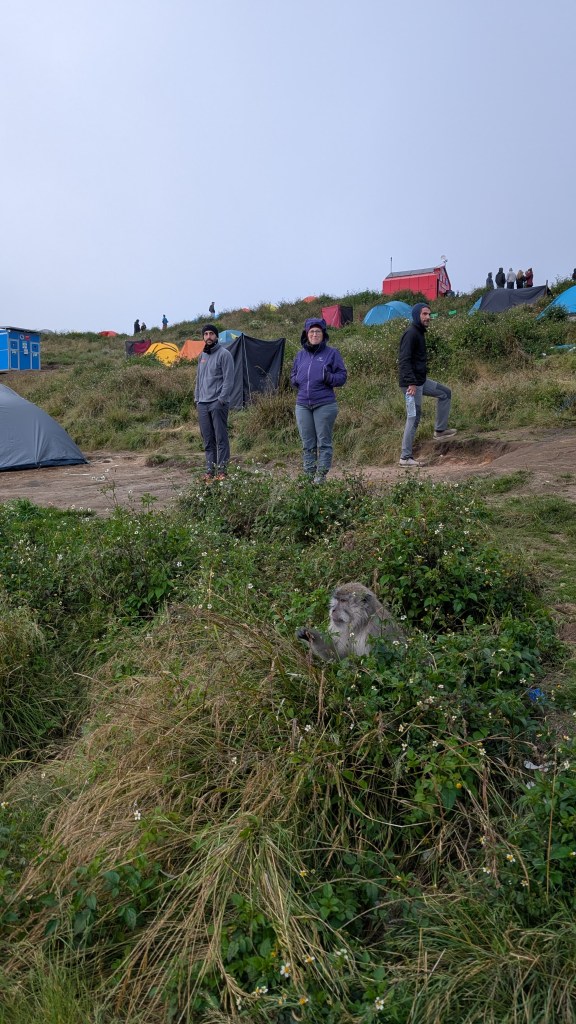 Après moultes marches, virages et rochers gravi, je finis par arriver aux abords du « rim », la couronne volcanique. Je suis accueilli par 2 macaques plantés sur le chemin qui ont l’air de se demander pourquoi les humains galèrent autant et prennent si longtemps pour monter si peu. Je fais quelques photos et les salue avant d’arriver 3ème après les frères Suisses dans la zone de notre campement. Et des tentes il y en a partout! Au moins 100, voir 150! C’est fou! Les porteurs des différents groupes s’affairent à les monter et à préparer une boisson chaude et un goûter avant l’arrivée de leurs clients fatigués. Ils sont vraiment aux petits oignons pour nous. Je leur communique mon admiration pour leur condition physique et leur rapidité et les remercie, un peu gêné, de s’occuper si bien de nous. Je ne sais pas s’ils ont compris grand chose mais j’espère au moins qu’ils ont senti que j’étais reconnaissant. Noémie arrive haletante et me dit d’emblée qu’elle ne sait pas comment elle va tenir les trois jours comme ça! Elle a peur pour ses genoux. Je la rassure et lui dit de se reposer un peu, que ça va bien se passer si elle va à son rythme et pas à celui du groupe. Elle me regarde, l’inquiètude dans les yeux… nous savons tous les deux que la deuxième journée risque d’être bien plus dure…