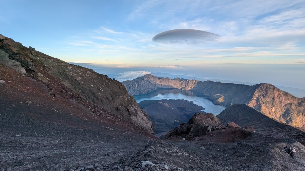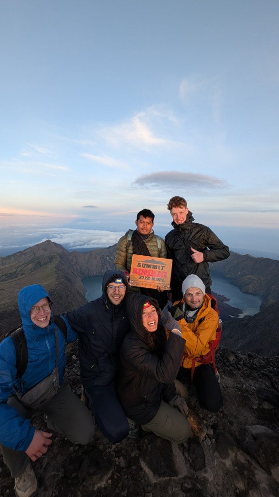Dans toute la splendeur d’une épique finale à rallonge, les trompettes pétaradent à tout va, les tambours battent forts et résonnent dans ma poitrine à intervalles réguliers, les violons font chauffer leurs archets, le triangle cingle dans tous les sens, les notes sont répétées et repétées, battuent en fanfare. Comme moi les trompettes s’époumonnent, la note finale se rapproche, surtout ne pas croire que c’est la fin, ne pas être pris de court, ne pas se réjouir trop vite ni vendre la peau de la bête avant d’avoir touché au but. C’est dans une explosion de notes et d’émerveillement que j’arrive enfin au sommet, les trompettes et violons poussent leur dernière mélodie en harmonie avec les chœurs qui tiennent la note tout en contrôle, les tambours et le triangle se taisent, le long hymne au destin qui a retenti en moi s’arrête d’un coup et me laisse admirer le paysage et le goût de l’accomplissement. Le Rinjani m’aura ouvert son royaume tout en me martelant de coups. Il m’aura réappris le sens des mots persévérance et récompense. Je suis ému et me rend compte que je suis le deuxième de notre groupe à être arrivé. Pas mal pour un quarantenaire!
