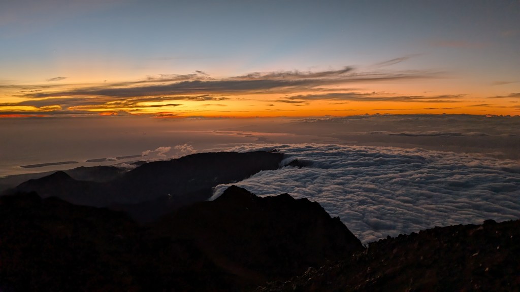 10 minutes après, Tim nous rejoint fatigué, suivi un autre 10 minutes plus tard par Marco et Véronica escortés par notre guide. On se félicite chaleureusement pendant que les premières lueurs du soleil donnent une lueur orangée à l’horizon et aux nuages qui l’accompagnent. L’océan de côton blanc se déverse lentement dans les diverses ravines et crevasses de la longue robe du volcan en contrebas. Nous sommes de plus en plus nombreux sur notre promontoire, les gens s’entassent et se battent pour les meilleurs points de vue. Les instagrameuses en herbe prennent toutes le même style de photos :