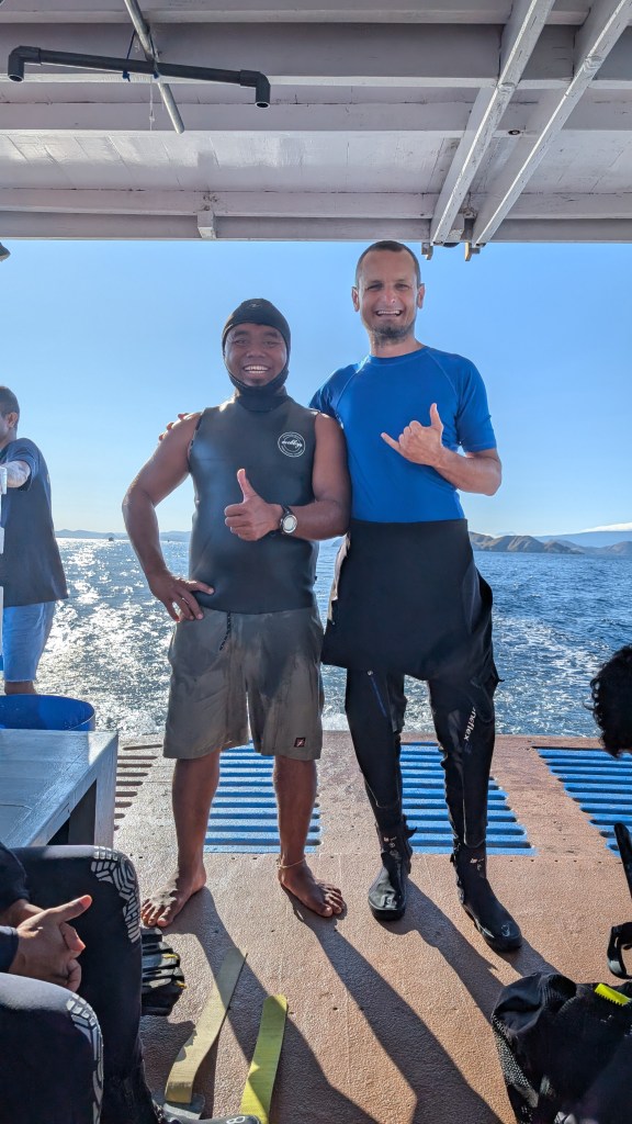 Et pour la suite du voyage, on a bien hâte d’ouvrir le sac de 20 kg de matériel d’escalade, qu’on traîne d’île en île, on espère se rapprocher d’une communauté de grimpeurs avec lesquels on pourra peut-être communiquer. Pour l’instant, notre stock n’est pas trop dérangeant. À Nusa Penida et à Labuan Bajo, le sac est resté à notre hébergement, demandant quand même un aller-retour supplémentaire pour les transits. Les indonésiens nous trouveraient petits joueurs, eux qui sont parfois à 5 sur un scooter, qui transportent poubelles, bidons d’eau, autre scooter, matelas, plywood! Sur Lombok, c’est le loueur de scooter qui nous avait gardé le sac pendant 10 jours : on apprend à lâcher-prise, à arrêter de se méfier. À Java, on a déjà placé quelques falaises sur notre itinéraire, c’est qu’on commence à avoir des fourmis dans les doigts, nous! Mais bon c’est bien, ça m’a permis de découvrir le monde sous le niveau de la mer, moi qui suis souvent perchée! C’est un monde fascinant, une activité contemplative, qui procure une sensation d’apesanteur. J’ai fait deux plongées avec des bouteilles mais comme, depuis, mon oreille n’a toujours pas retrouvé sa pleine capacité, je me contente pour l’instant du snorkeling (palmes, masque et tuba).