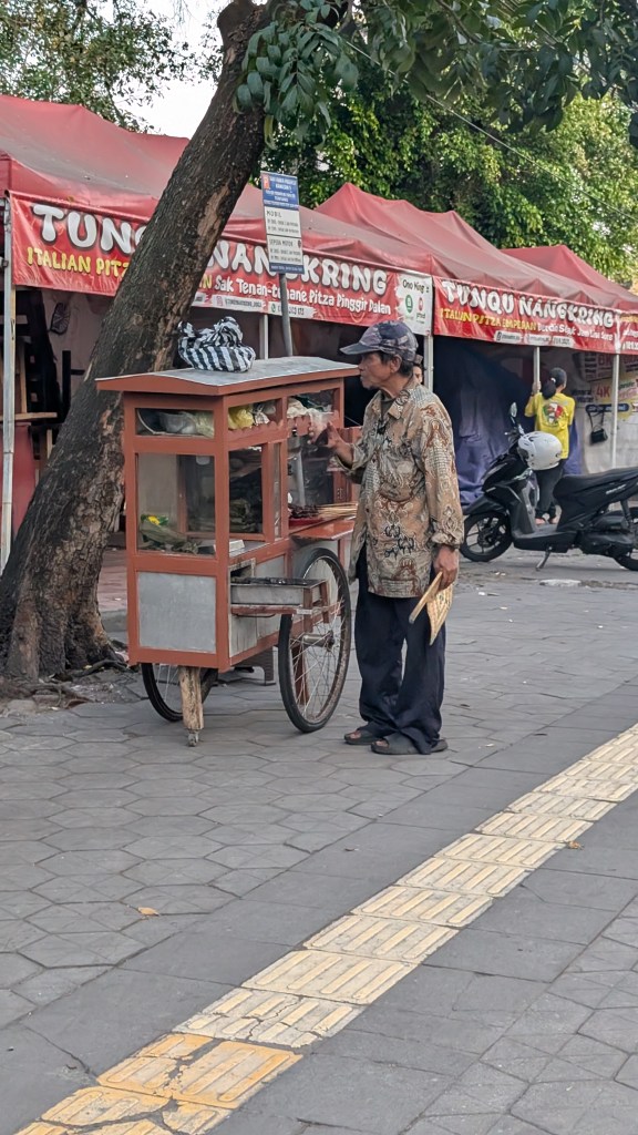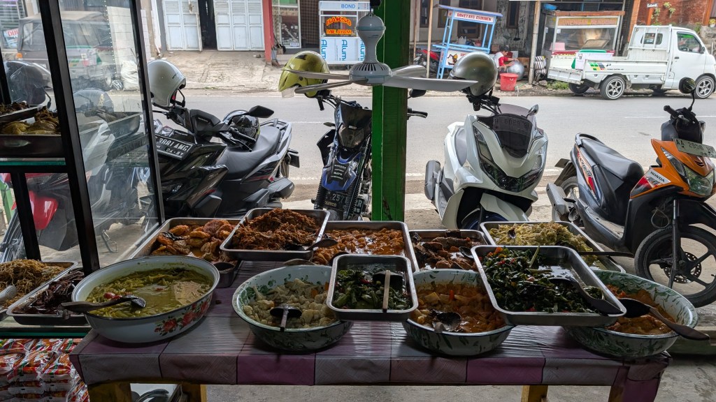 Cela dit, notre amaigrissement est sûrement dû aussi à la nourriture, un autre aspect quelque peu dépaysant de l’Indonésie! Il faut savoir que la base de la nourriture, c’est le riz, et que pour accompagner un riz blanc, ils aiment bien les protéines frites, et de préférence dans de la panure (poulet frit, poisson frit, crevettes frites, tofu frit, omelette frite). La nourriture de rue est très courante, on en trouve absolument partout, et dans ces petits Warung (shop), comme on ne comprend pas toujours le menu et Google Translate non plus, on a fait des essais culinaires. On a mangé des brochettes de peau de poulet semi-grillées, du tofu un peu trop fermenté, de la purée de manioc bouilli au sucre, des bonbons gluants au riz cramé, et j’en passe. Malgré tout ça, nos intestins tiennent le coup, c’est notre cœur parfois qui ne veut plus rien avaler, alors on se rabat sur les fruits exotiques frais. Et à force d’essai-erreurs, notre instinct de survie nous fait retenir quelques essentiels : nasi c’est le riz, ayam le poulet, ikan le poisson et spicy, ça c’est international, et ça vient toujours avec un éclat de rire quand on demande « no spicy ».