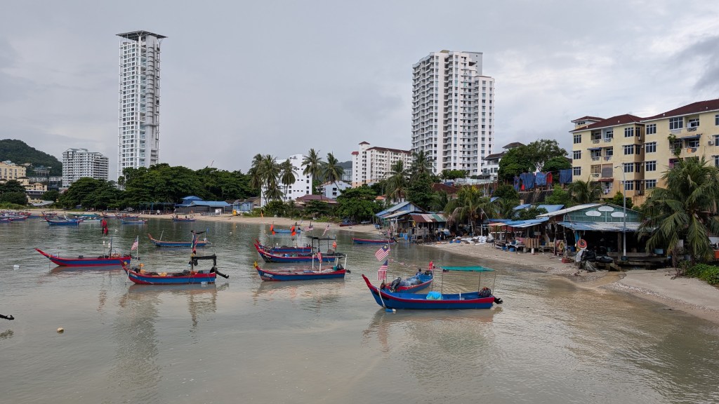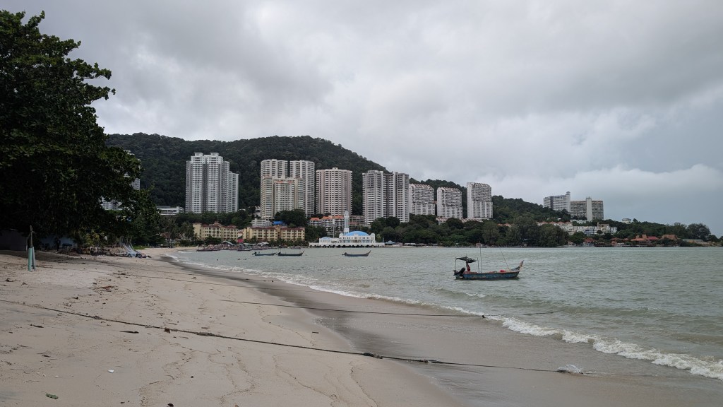 Cela dit, un point positif dans tout ça, c’est que ça nous a un peu foutu un coup de pied au cul pour se dire qu’en fait, on est venus aussi pour faire de l’escalade. Arrêtons de, j’allais dire papillonner, mais arrêtons d’essayer. Allons là où il y a les sites d’escalade et allons voir ce que ça a, ce que la Malaisie a à nous donner, en fait, en termes de sites d’escalade. Et en même temps, à Penang, il y avait un site d’escalade, justement. C’est vrai. Qui était somme toute correct, mais ce n’était pas non plus waouh waouh waouh. Je pense que ça a rajouté aussi, on était supposé, on avait pris exprès un logement qui était proche d’une plage pour changer un peu les montagnes qu’on n’avait pas trouvées extraordinaires, etc. Et de la ville. Et là, on arrive, et en fait, la plage, il y a des grands gratte-ciels tout autour. Ce n’est pas très beau. La mer, ça ne donne pas envie. Elle est un peu marron. Elle ne donne pas envie de se baigner dedans. Donc, je pense que ça nous a vraiment… Tu te souviens, on s’est vraiment demandé, mais en fait, qu’est-ce qu’on fout là, quoi ? On s’est demandé qu’est-ce qu’on fout là. On s’est dit, on dirait que c’est un pays qui s’est développé trop vite. Et donc, il n’y a pas eu de réflexion sur une certaine uniformité architecturale, etc.