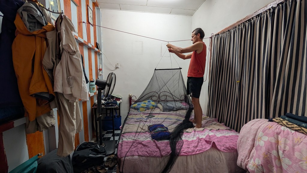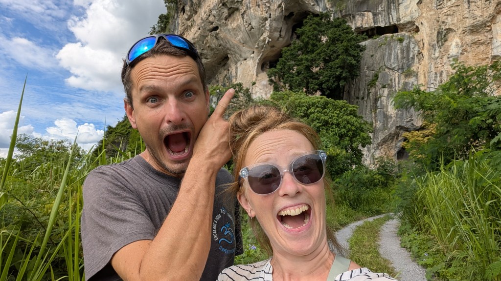 Et puis ça nous a permis aussi d’approfondir en fait une relation avec Amirul. Justement, on se disait en Indonésie, c’était un peu dommage parce que justement, on n’arrivait pas à avoir des vraies conversations au-delà d’où tu viens et combien de temps tu restes dans mon pays. En grande partie à cause de la langue. Oui, en grande partie à cause de la langue, mais aussi, je pense, en partie parce qu’on ne restait pas longtemps au final. Alors que là, on était là longtemps, Amirul a pu aussi nous raconter des choses sur l’histoire de sa région, sur tous les apprentissages qu’il fait en faisant de l’exploration de grottes aussi, parce qu’il fait ça aussi. Et puis après, il y a les Climbing Backpackers qui sont rentrés dans le décor aussi. Là, c’est deux voyageurs du Royaume-Uni, qui eux, voyagent sur le long cours et qui font 95% de leurs voyages, c’est de l’escalade en fait. Qui voyagent à très, très, très petit budget. Genre 40 dollars canadiens / 30 euros par jour pour deux, incluant les transports, la bouffe, l’hébergement, tout, tout, tout. Donc, c’était vraiment intéressant de partager ce moment avec eux. Puis, ça a renforcé l’esprit de famille qu’on a pu créer. Oui, vraiment.