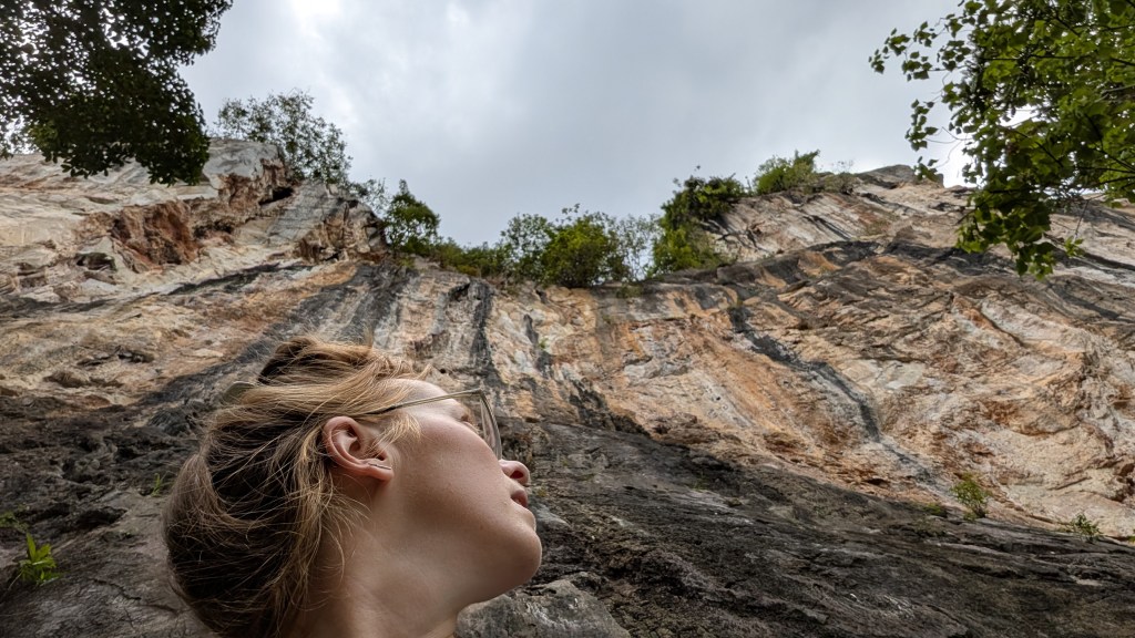 Une fois notre voiture stationnée devant des maisons uppées, se demandant si la fourrière n’allait pas nous l’enlever, il nous a fallu marcher sur un petit chemin en sandwich entre plusieurs maisons et une dense forêt. Puis d’un coup il faut s’enfoncer dans la jungle juste à côté d’une antenne relai afin de trouver la falaise bien cachée des êtres humains. Ici les seules voies faisables pour nous, soit entre 5.10b et 5.11a pour l’instant (entre 6a et 6c), font entre 6m et 15m et le sommet n’offre aucune autre vue que la moitié supérieure des arbres. La roche, elle, nous est plus familière puisque c’est du granite. Fait inusité : c’est comme si la paroi proposait des défis de grimpe pour droitiers! Donc nous étions tous les deux désavantagés, Noémie étant gauchère et moi un droitier un peu spécial! Une opération au poumon droit lors de ma jeunesse ayant en effet limité mes capacités et mon endurance du bras droit.