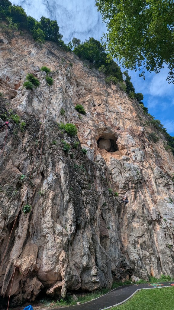 Vu la facilité d’accès, le nombre de voies pour débutants et l’extrême proximité avec Kuala Lumpur, le bas de la paroi semble un peu patiné. Noémie en a d’ailleurs fait les frais avec une belle chute de 1m au sol alors que je l’assurais du sommet. Avec l’élasticité de la corde, je n’ai rien pu faire. Il faut aussi souligner la présence d’un chemin pavé hyper glissant et laissant de grosses traces noires au pied de la paroi. Donc assureurs prenez garde car ceci rend l’assurage du grimpeur de tête un peu dangereux. Et si vous vous éfoirez de tout votre long comme Noémie dessus, vos vêtements s’en souviendront longtemps…