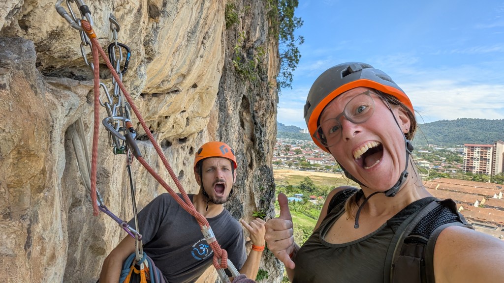 Niveau escalade, c’est épuisés, très affaiblis et avec plusieurs kilos de muscles et de graisse en moins que nous avons eu notre première expérience à l’une des 6 parois des Batu Caves :