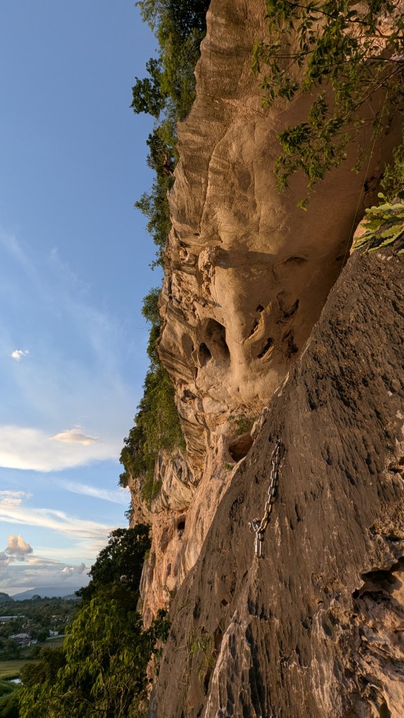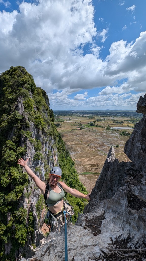 Les parois sont dans un lieu caverneux et les défis, tout comme les niveaux, y sont variés. Une voie en particulier a retenu mon attention dès notre arrivée : une cheminée de niveau 5.10d (6b+) où la moitié de la voie se fait à la frontale dans une obscurité totale. Hyper intimidant! Par faute de temps, je n’ai pu l’essayer, mais elle fait pour sûr partie de mes projets lors de notre prochain passage à Perlis!
