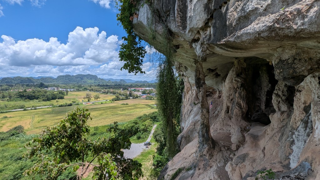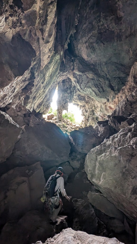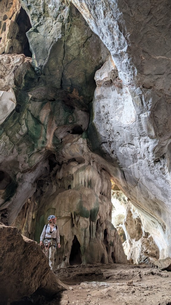 Et en parlant de grotte, que dire de cette immense caverne de plus de 50m de haut, remplie de fiantes de chauve-souris et d’éboulis, à laquelle nous avons accès grâce à des échelles et cordages installés sur le mur principal et que nous devons traverser à la frontale afin de rejoindre un autre pan de mur aux voies excitantes (Robot Wall), le tout révélant au passage un superbe paysage de l’autre côté de la vallée?