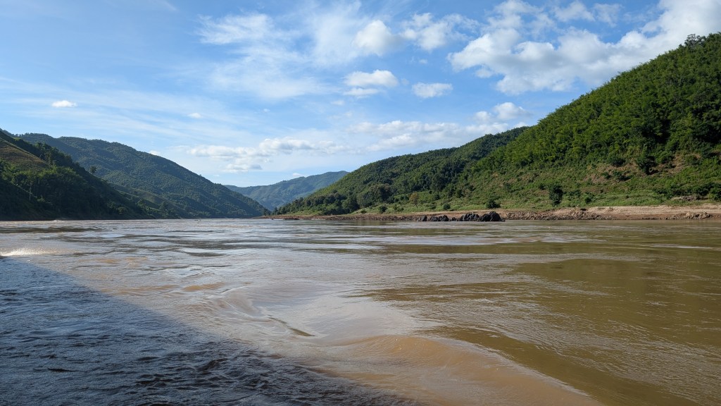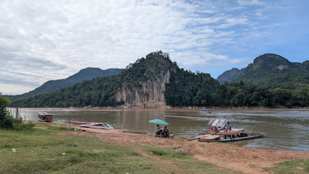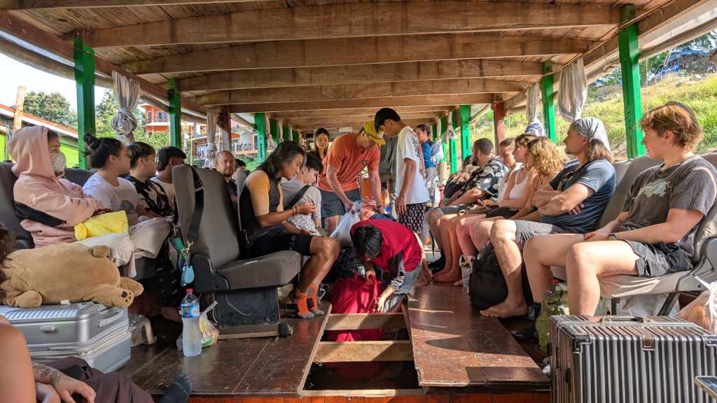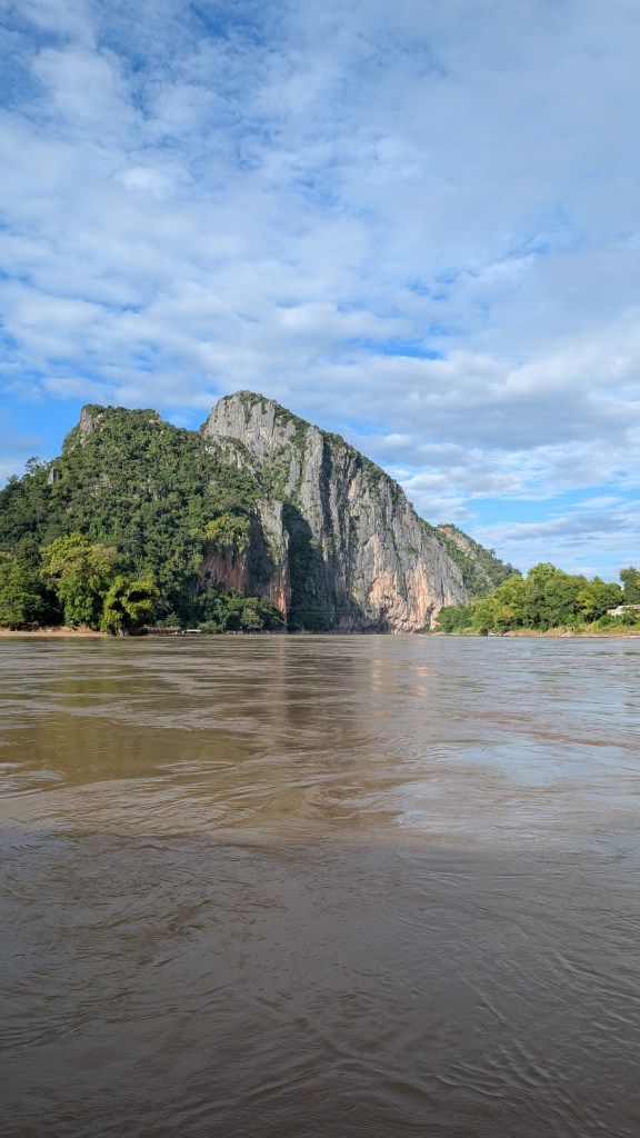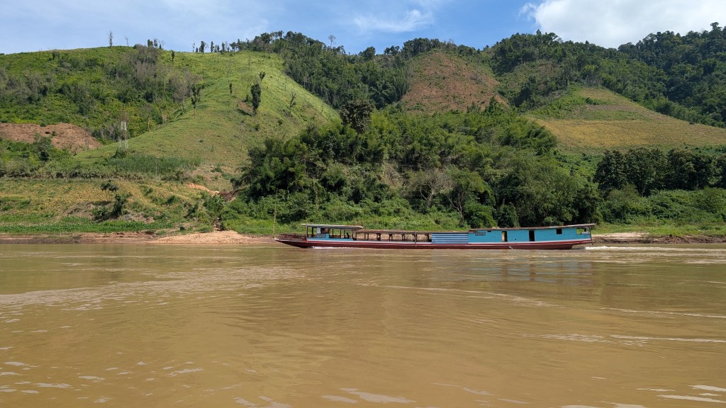 On a fait tamponner nos passeports à la frontière Thailande-Laos le 29 octobre, et le lendemain on embarquait dans un transport public aussi populaire des locaux que des touristes : le slow boat. La rivière du Mékong prend sa source sur les plateaux tibétains et se jette dans la mer au sud du Vietnam. Elle est un axe privilégié de déplacement, quand les routes bitumées se sont transformées en gruyère de nids de poule, à l’image du pays qui bat le triste record du plus bombardé au monde. Le trajet se découpe en deux journées de 6 et 7h respectivement, avec une pause d’une nuit dans le village de Pak Beng. Le départ est annoncé à 9h30 mais on comprend bien vite que le bateau attendra tous les retardataires, pour un départ ce jour là à 10h20.
