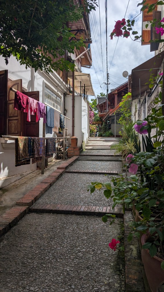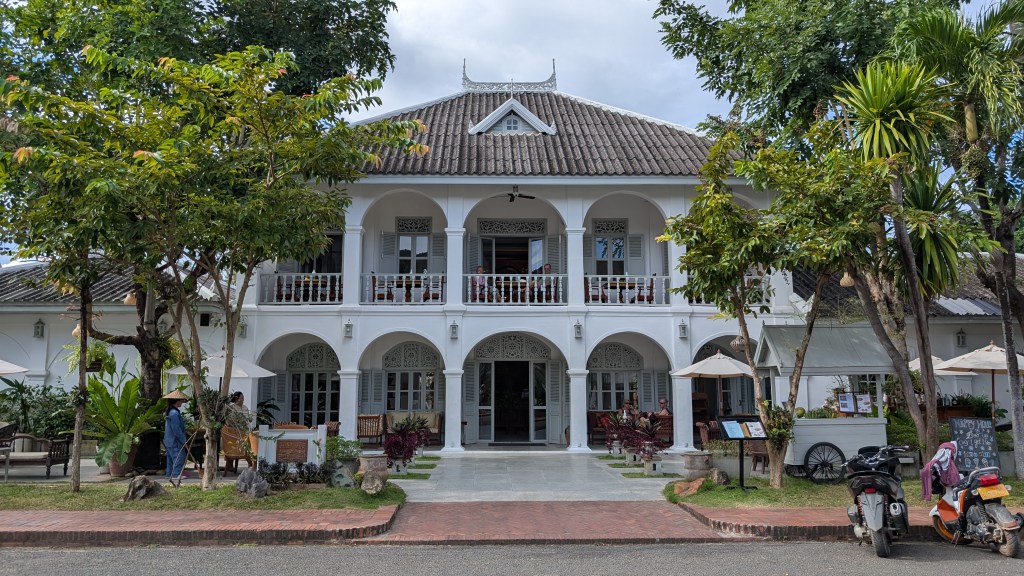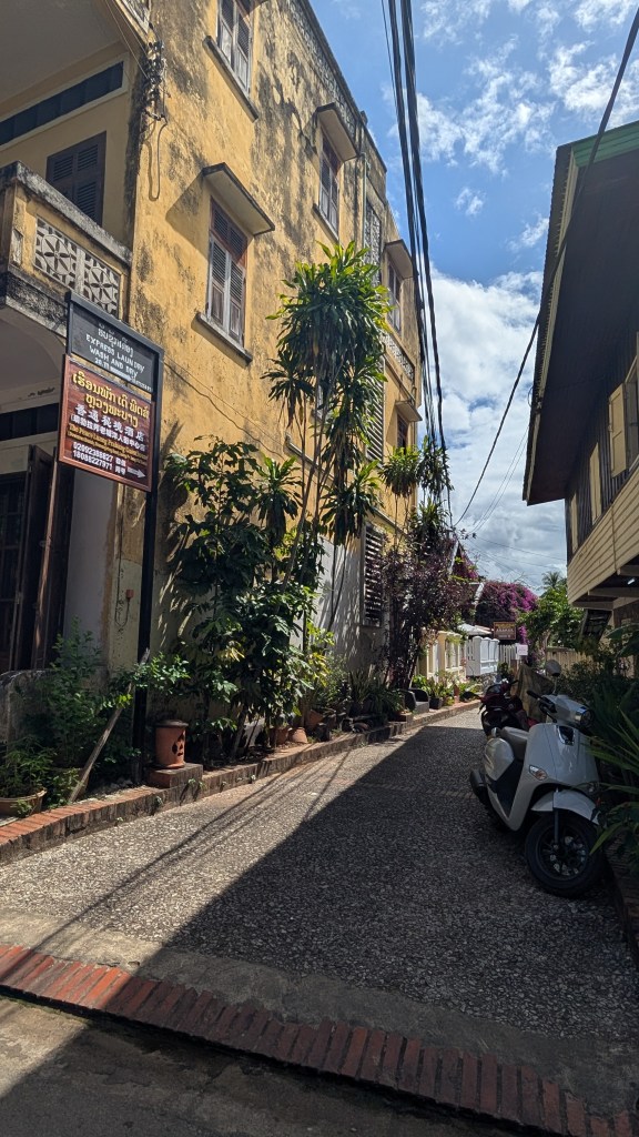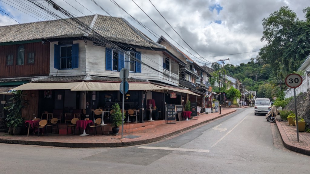On descend du bateau à Luang Prabang, ville inscrite au patrimoine Unesco. Elle a conservé à merveille l’architecture coloniale française, et on prend un réel plaisir à déambuler dans les rues et les ruelles sans plan pour la journée, sans but précis. Par hasard, on tombe sur le marché matinal et instantanément on se souvient qu’on est au Laos, avec les étalages de fruits sur une bâche à même le sol, des viandes qui trempent dans des bassines, les croustilles d’algues du Mékong, des crapauds et des cadavres de corbeaux. Un peu plus loin, des chants répétitifs proviennent d’un temple bouddhiste où se déroule une cérémonie de remise de robes pour les jeunes moines. Et si on a un petit creux, on entre dans un restaurant à la française où l’on peut commander un croissant au beurre et se faire alpaguer par une mamie laotienne ravie d’utiliser les quelques mots de français qui lui restent de la colonisation. La ville se prête bien à la déambulation.