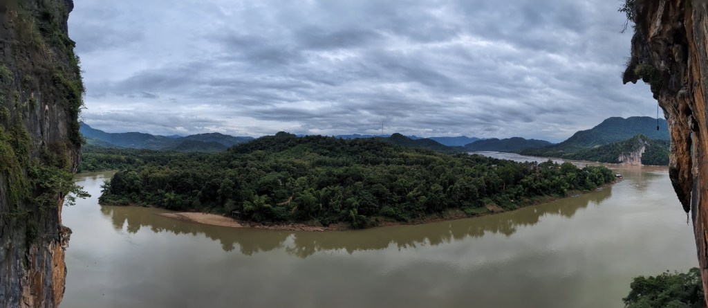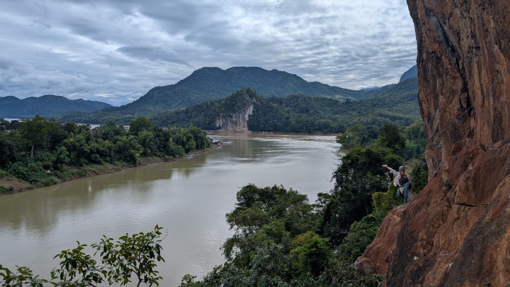 Une fois qu’on en a eu fait le tour, on a pris une journée pour aller explorer le site d’escalade du coin : Eagle Wall. C’est le genre de site qui demande toute une expédition. On sait à quelle heure ont part mais pas à quelle heure on arrive, ni exactement comment on va se rendre là où on veut aller. On roule 50 minutes en scooter vers le nord, jusqu’au bout d’une route de très mauvaise qualité dans le village de Pak Ou. De là, il faut se rendre à la plage et trouver une personne qui veuille bien nous amener en bateau au pied des falaises. C’est le lieu d’embarquement des touristes qui veulent aller à la grotte, mais nous voulons aller dans la direction opposée. Mathis réussit tant bien que mal à nous négocier un lift, et lorsque quelques minutes plus tard il nous débarque sur une plage qu’on pense être la bonne, on espère qu’il a bien compris de venir nous rechercher 6 heures plus tard. Mais pour l’heure, on s’enfonce dans la jungle dans la direction de la falaise. On monte, on monte, à travers les lianes et tout à coup, on émerge au pied d’une paroi immense, orange et blanche, qui surplombe le fleuve, promettant une vue imprenable en haut des voies. Si trouver la falaise était toute une aventure, trouver les voies est une autre paire de manches. Quand un site n’est pas grimpé, la végétation reprend ses droits et il est parfois difficile de trouver les ancrages parmi les plantes grimpantes. Finalement, on se lance dans ce qu’on pense être une 5b, avec possibilité d’une 6b ensuite, où Mathis se retrouvera nez à nez avec une chouette endormie couvant ses petits. Pour ma part, le temps manque pour une deuxième longueur mais la vue à elle seule me comble. Il est déjà l’heure de retourner à la plage, où notre capitaine de barque nous rejoint à 16h15, assez pour nous faire stressée un peu. Ce sera notre seule visite à Pak Ou. Nous avons ensuite une excursion dans un centre de conservation d’éléphants avant de nous diriger vers le sud, à Vang Vieng.