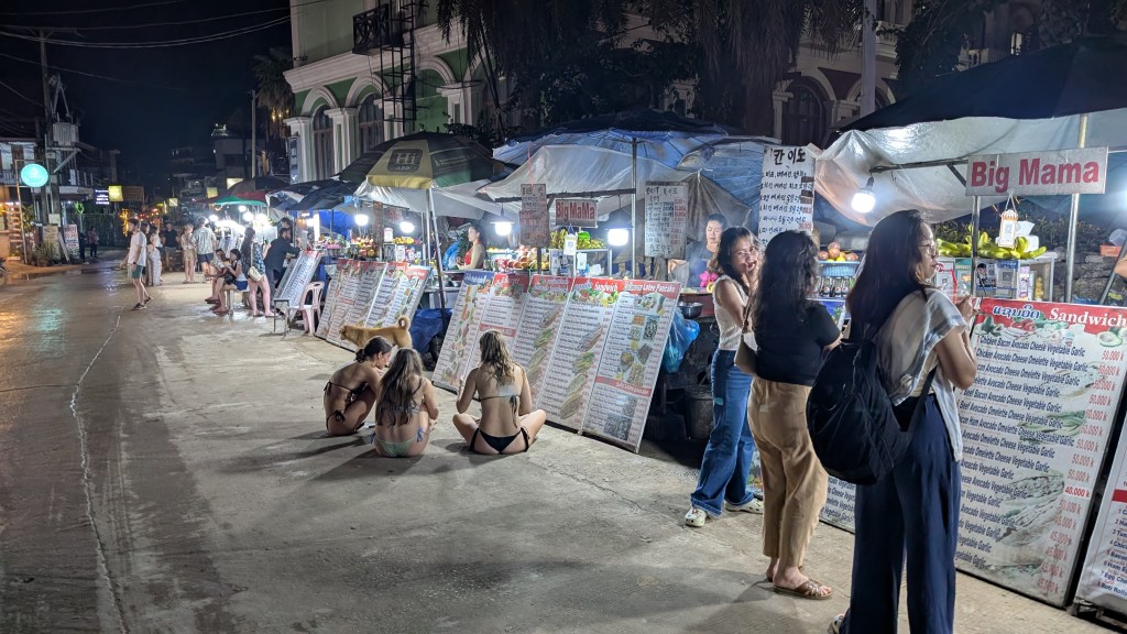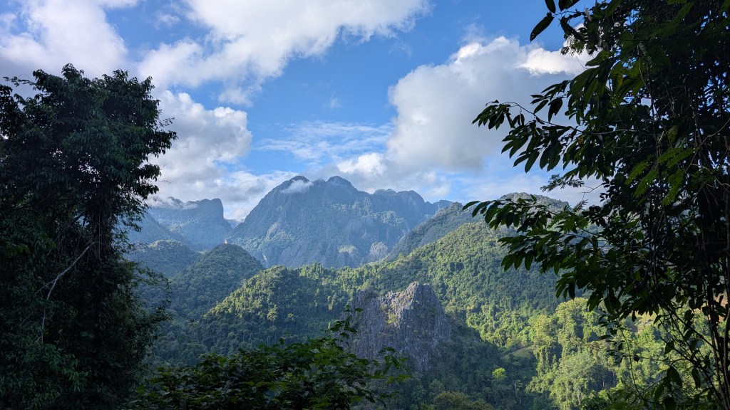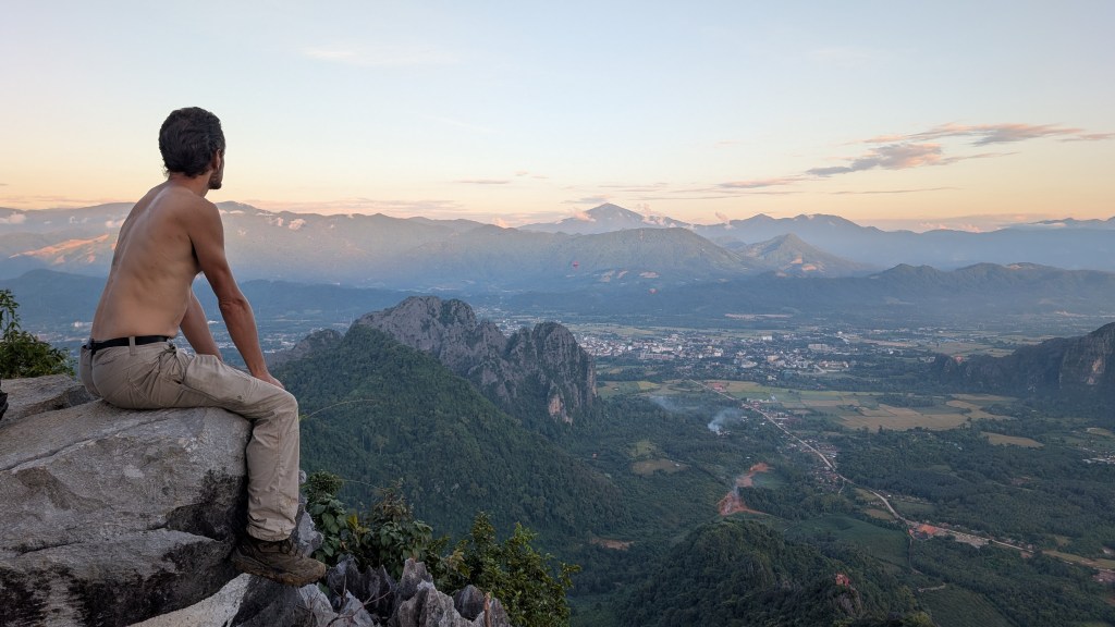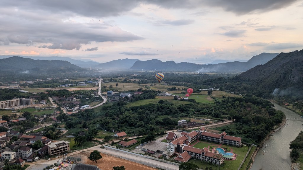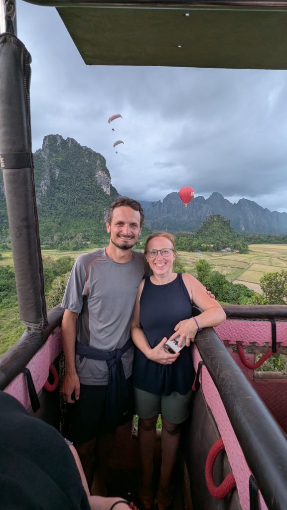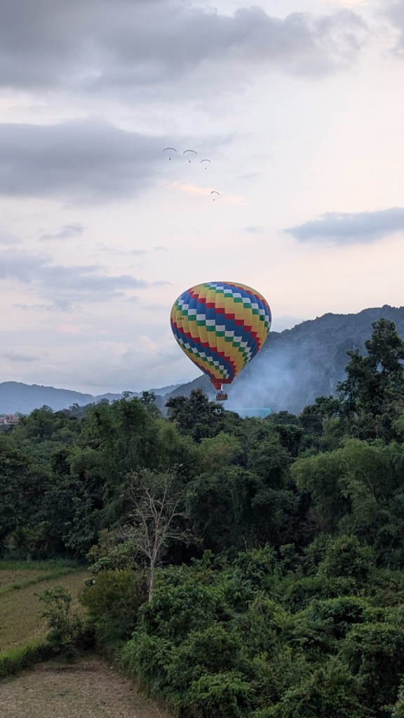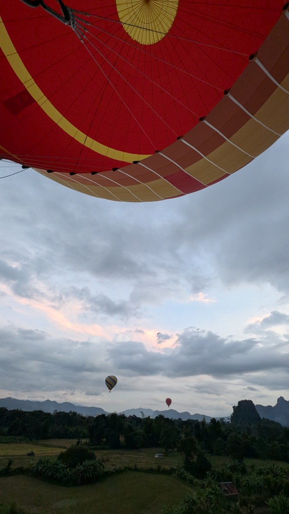 Je laisserai Mathis le soin de vous parler des éléphants ainsi que de la grimpe au Laos, principal prétexte de notre visite à Vang Vieng. C’est une ville où convergent les touristes qui veulent combiner plein air et nightlife. Une grande partie des commerces ont organisé leur business autour du plein air et il y en a pour tous les goûts : descente de rivière de chambres à air ou en kayak, randonnée, visite de grottes, lagons bleus, tour de kart, tour en paramoteur… Et un jour, c’est Noël. Avec un mois d’avance, Mathis me fait la surprise d’ un vol en montgolfière. Je les avais admirées de loin, en haut d’une randonnée escarpée qu’on avait finie à la frontale. Je n’avais pas imaginé que je monterai dedans! Un tuktuk vient nous chercher et nous conduit dans une grande plaine où on attend pendant une bonne heure. Et tout d’un coup, tous les montgolfiers s’activent. On sort les paniers en osier des pickups et on les fait basculer sur le flanc. On déploie les toiles des ballons. On allume de puissants ventilateurs pour gonfler les toiles, puis on y injecte de l’air chaud et enfin, on redresse le panier et on peut monter dedans, sous cet énorme ballon qui se dresse au-dessus de nous. Je n’ai même pas realisé qu’on avait decollé tellement c’était doux. Comme on se déplace à la vitesse des courants d’air, on a une impression de lenteur. Le montgolfier remet les gaz et on s’élève tranquillement, nous frôlons les arbres avec une précision d’horloger, avec l’impression qu’on va les toucher. Il maîtrise son art, entraînant le ballon dans une montée en spirale pour nous offrir une vue à 360 degrés sur la ville et la vallée. C’est magnifique de voir les autres montgolfières au loin, ça ajoute du grandiose au paysage. Malgré le bruit des brûleurs qui sont régulièrement actionnés, la montgolfière procure une sensation de calme et de paix. Dire qu’on se déplace au gré des vents. Dejà on redescend, notre chauffeur a repéré un champ pour atterrir tout en douceur. Joyeux Noël!