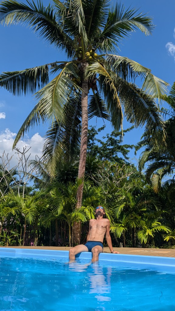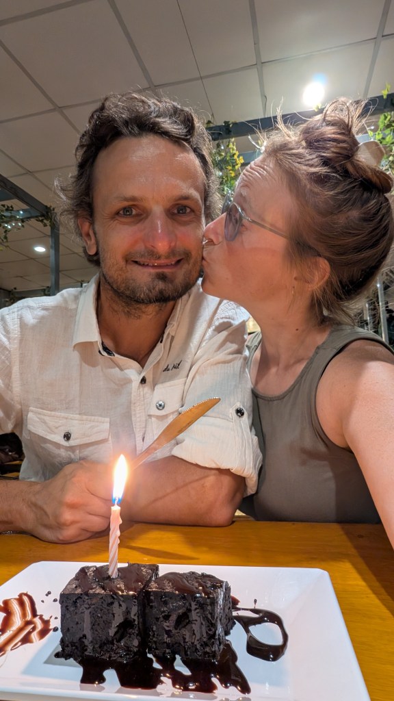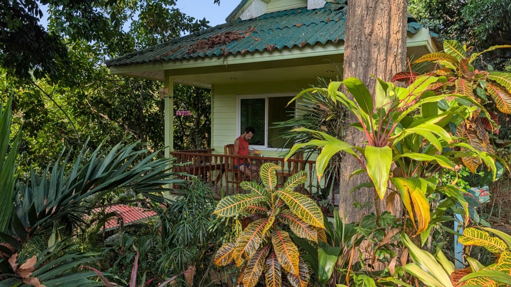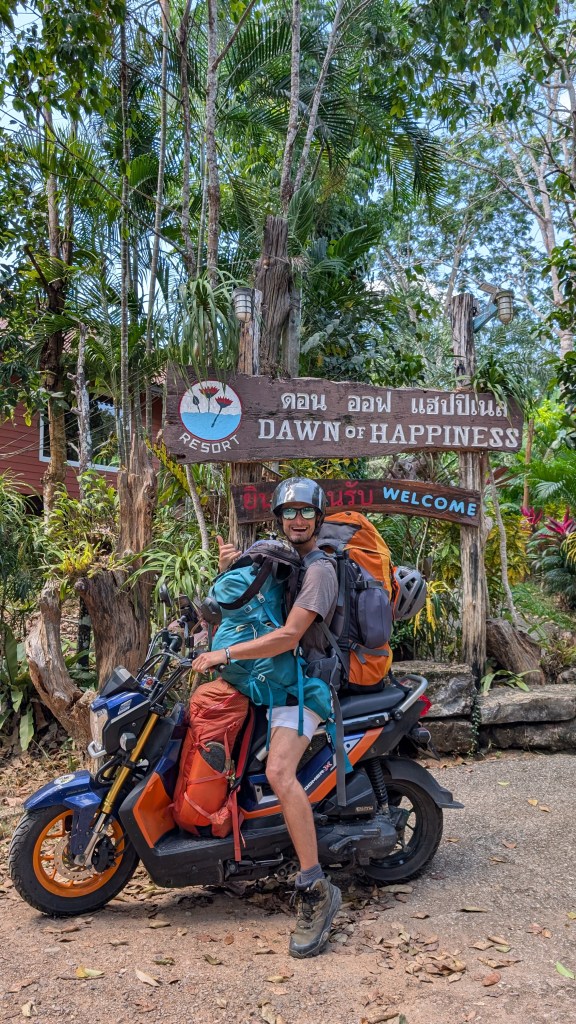 Retournons quelques semaines en arrière, fin décembre. À Huu Lung, Dave et Nettie (qu’on avait rencontrés à Perlis en Malaisie) nous mettent en contact avec Gordon, un grimpeur canadien septuagénaire qu’ils avaient rencontré quelques semaines plus tôt dans la région de Krabi. Comme beaucoup de grimpeurs, Gordon a loué un bungalow à prix réduit pour 3 mois, mais il aimerait écourter son séjour pour aller faire un saut de puce à Pha Tam Khan au Laos (où on était en novembre). Il cherche donc à sous-louer son bungalow pour une semaine, et ça tombe à point pour nous! Grâce à Gordon, on bénéficie d’un super bon deal dans un resort paisible et un peu excentré, avec une piscine. On est aussi assez proche d’une incroyable falaise nommée North Wall, moins populaire que Tonsai car éloignée de la mer. On a donc atterri pour 5 jours dans ce petit coin de paradis pour fêter l’anniversaire de Mathis et se remettre de petits bobos de grimpe.