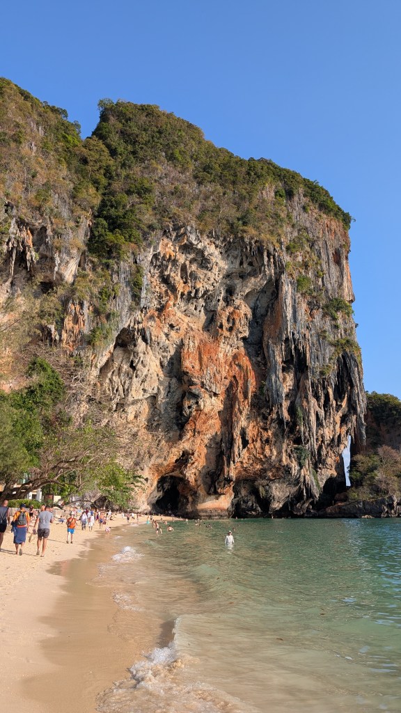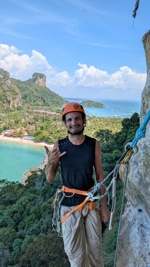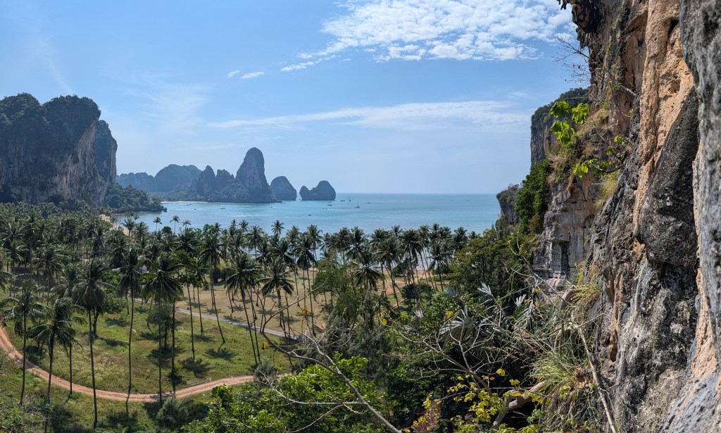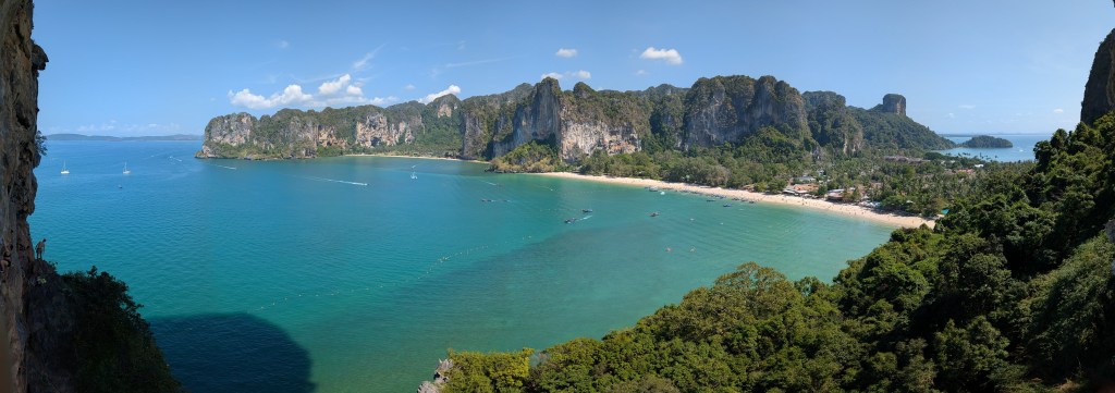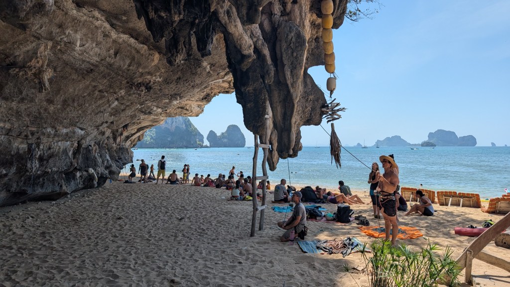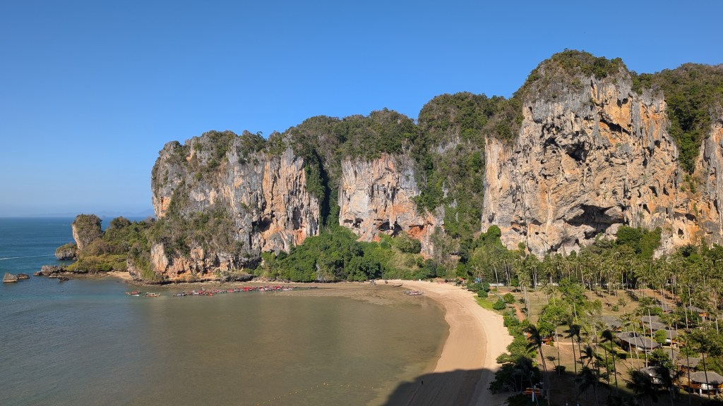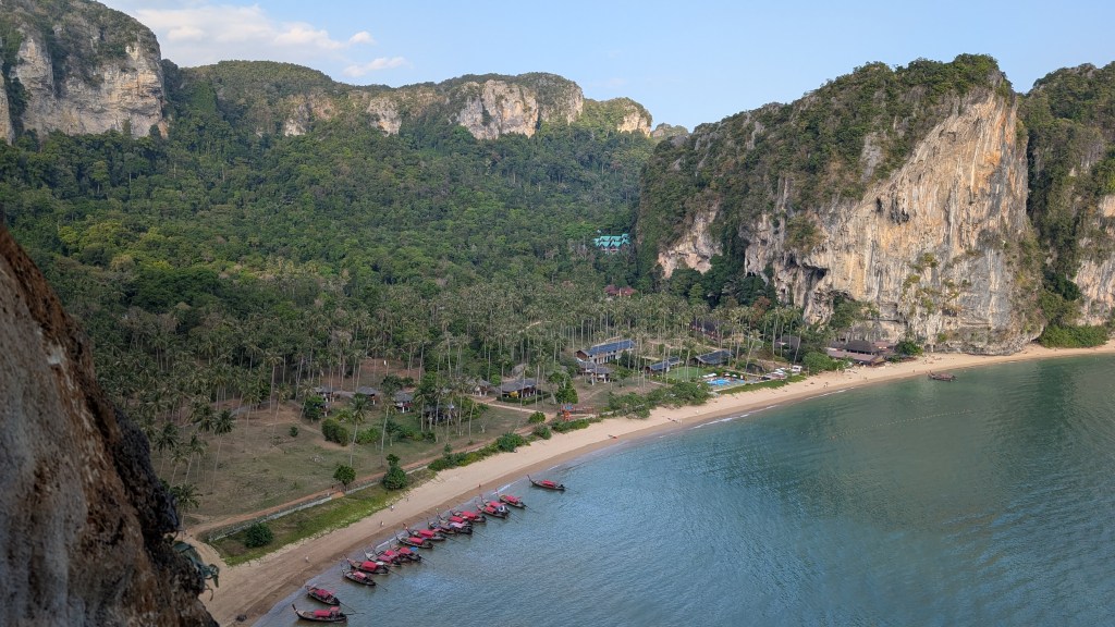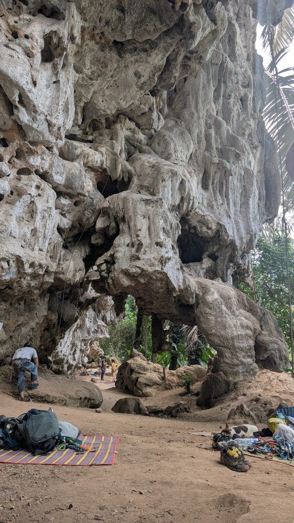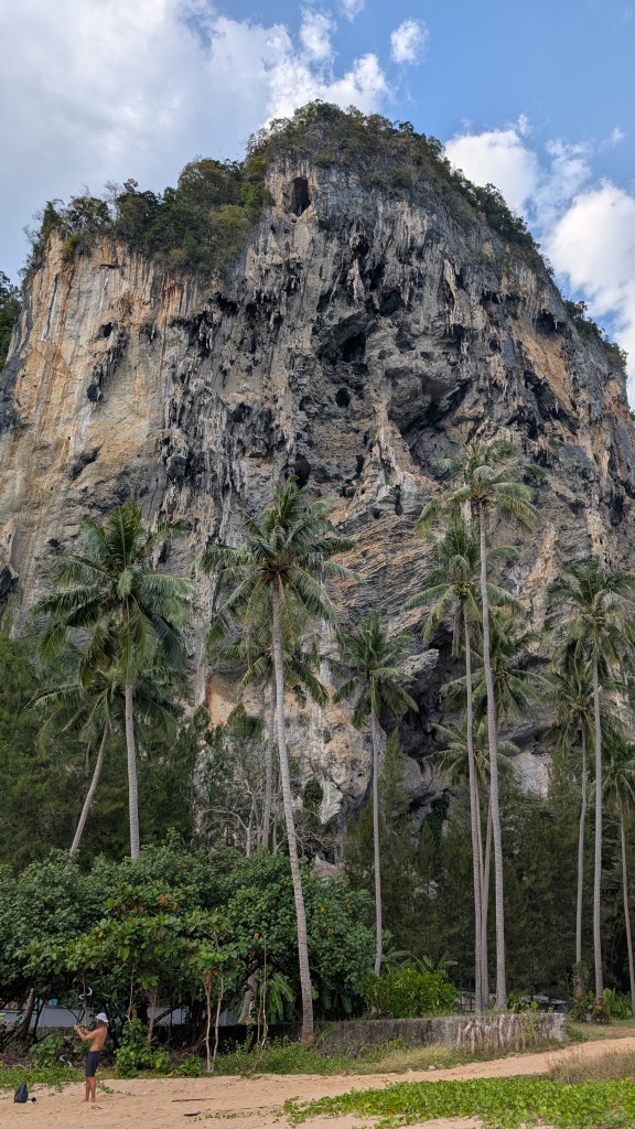 Peu connu pour ses gibbons, et on en est très contents, ce petit coin de paradis a une renommée internationale dans le monde des grimpeurs. S’il est une destination où amener sa corde et ses souliers en Asie du sud-est, c’est ici. Imaginez un site d’environ 700 voies sur des falaises de calcaire de plusieurs centaines de mètres au dessus de la mer, où on peut grimper à l’ombre toute la journée par 30⁰C, au gré des marées, puis aller siroter un cocktail sur la plage au coucher du soleil en jasant escalade sur fond de musique reggae.