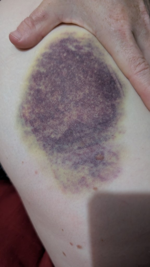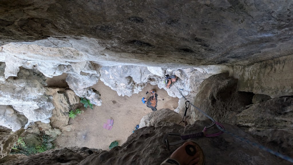 À North Wall, perché dans la voie sur laquelle je m’exploserai la fesse gauche quelques minutes plus tard, Mathis se met à jaser avec Yvan, cet adorable monsieur que nous avions rencontré 2 ans plus tôt aux Gunks, au nord de New York, sur la magnifique voie trad du nom de Madam G. Oui, il se souvient de nous, il avait attaché son chien un peu plus loin parce que j’en avais peur. Yvan est préposé aux bénéficiaires aux États-Unis, il adore son travail, mais la moitié de l’année, il vient rejoindre sa femme en Thailande et en profite pour faire de l’escalade. D’ailleurs, son téléphone sonne, c’est elle. Attendri, il lui demande ce qu’elle a mangé pour dîner. Elle ne grimpe pas, et d’ailleurs on n’a pas vu beaucoup de thaïlandais grimper. Le sport national c’est plutôt le Muay Thai, ou boxe thaïlandaise, et il y a un centre d’entraînement juste à côté de North Wall. Tout en grimpant, on peut entendre les combattants crier et taper sur le punching bag, une petite touche d’authenticité. Bref. Yvan a donc appris les techniques pour faire du solo encordé : il pratique sa passion dans la plus grande autonomie. On échange nos contacts et le lendemain il prend des nouvelles de mon popotin. Je vous décris donc rapidement la situation, aucunement grave soyez rassuré : je grimpais en moulinette, allant nettoyer la magnifique voie que Mathis venait d’ouvrir. La première dégaine était accessible en montant sur une grosse stalactite d’environ 3 mètres de haut tombée au sol. Pour aller la déclipper, je me suis engagée au-dessus de cette protubérance rocheuse, et mon crochet de talon, que je croyais solide, a glissé. Avec l’élasticité de la corde, je suis tombée à la renverse sur la stalactite. Rien de cassé, mais de la difficulté à m’asseoir et à marcher pendant 3 jours et une énorme contusion dont nous avons observé l’évolution de couleurs pendant 10 jours (et qui se devin encore au moment où j’écris ces lignes). Ça a fait vraiment mal et ça nous a forcé à ralentir, mais y’a pire que de se reposer au bord de la piscine qu’on n’aurait jamais pu se payer sans le bon plan de Gordon!