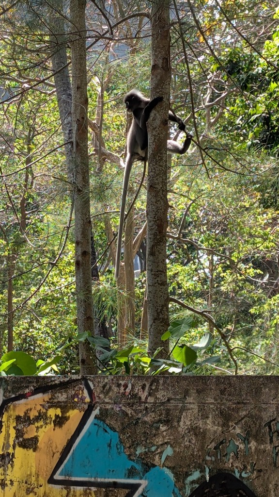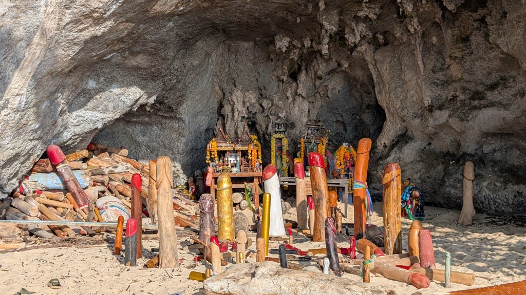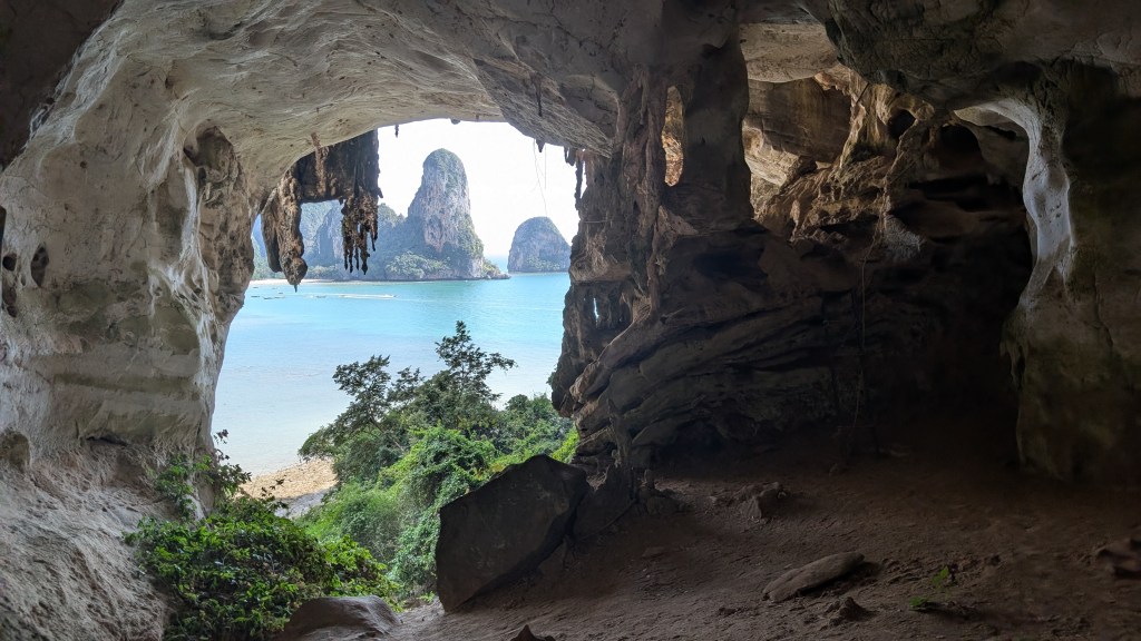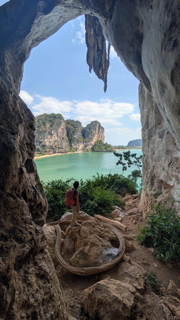 Après ces vacances forcées, on a migré vers Tonsai, dans une jungle hut, à côté de notre nouvelle cantine : Mama Chicken, et au milieu des langurs, ces petits singes reconnaissables par leur pelage noir et leurs yeux et bouche cernés de blanc comme s’ils s’étaient tartinés de labello. Fait isolite d’ailleurs : leurs bébés naissent tous d’un roux vif, mais aucun adulte n’a cette couleur. Ils venaient nous visiter au petit-déjeuner ou balancer des fruits sur les toits de nos huttes vers 4h du matin. Depuis Ao Nang, ville ultra touristique dont le bord de mer est un enchaînement de magasins de souvenirs, de shop de canabis, de restaurants, et de spectacles de jonglerie avec du feu au coucher du soleil, on achète nos billets de bateau, car il n’est pas possible d’y accéder autrement. Enfin, il paraît qu’il y a un petit sentier très peu frequenté qui passe dans la jungle et les serpents, mais on n’a pas osé s’aventurer. On descend sur la plage avec nos bagages, on retire nos chaussures et on joue avec les vagues pour essayer d’être le moins mouillé possible en montant dans le bateau. Les embarcations sont des longtail boat propulsés par un moteur à cœur ouvert de la taille d’un frigo qui semble peser des tonnes. Le pilote utilise d’ailleurs ses bras et ses jambes pour le manœuvrer comme il peut et sortir du « parking » à bateaux sans couper avec son hélice les cordes des ancres des autres navires. On navigue ensuite en direction de Tonsai pendant 15 minutes, avec un bruit de moteur si fort qu’on ne s’entend pas parler, nous laissant tout le loisir de regarder l’eau de mer s’infiltrer à travers les lattes de la coque… mais ça a l’air normal, alors Bo Penh Nyang! Le pilote nous dépose à la plage de Tonsai pour repartir aussitôt délivrer sa cargaison de touristes sur la plage voisine de Railay.