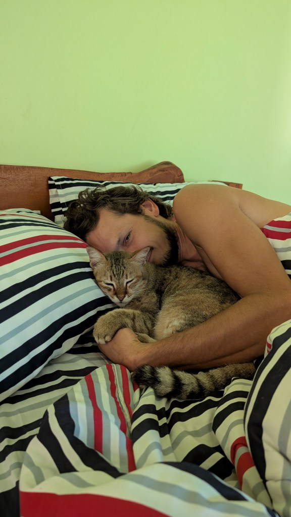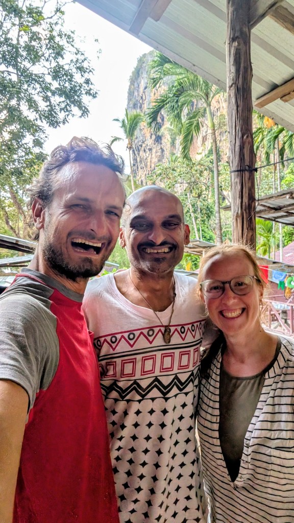 En parlant de coincidence, il faut aussi que je vous raconte cette histoire. En prévision de nos longues heures de transport du Vietnam vers la Thailande, j’avais téléchargé quelques épisodes de podcast pour faire passer le temps. Ça m’avait amenée à découvrir le podcast Ageless Athletes, qui parle de personnes qui continuent de pratiquer leur sport et d’y performer, malgré les contraintes physiques que leur impose le fait de vieillir. Parmi ces athlètes, beaucoup de grimpeurs y sont mis de l’avant, et je trouvais le sujet hyper intéressant par rapport à notre créneau de Beyond the Cruxes : on parle moins de performance que de santé mentale et de transformation personnelle. Et puis on avait abordé ce sujet aussi dans un épisode enregistré avec Stéphanie à Chiang Mai, qui avait mis en place des ateliers d’escalade pour les personnes de 50 ans et plus, pour ramener du mouvement dans leur vie et aider à reprendre de la confiance et du pouvoir sur un corps vieillissant. Par réflexe, j’ai été m’inscrire sur le compte Instagram de l’hôte de ce podcast et… Instagram nous dit souvent plein de choses. Surprise, Kush Khandelwal était à Tonsai là, là. Je l’ai contacté, et on est allé le rencontrer pour enregistrer un épisode de la saison 2, avec lui. Vivant aux États-Unis, il est ici pour quelques semaines avant d’aller visiter sa famille en Inde. On a eu une rencontre inspirante, devant sa hutte, où il nous a notamment raconté comment son histoire personnelle l’avait amené à produire ce podcast. Parfois, il y a des coïncidences qui nous confirment qu’on a fait le bon choix.